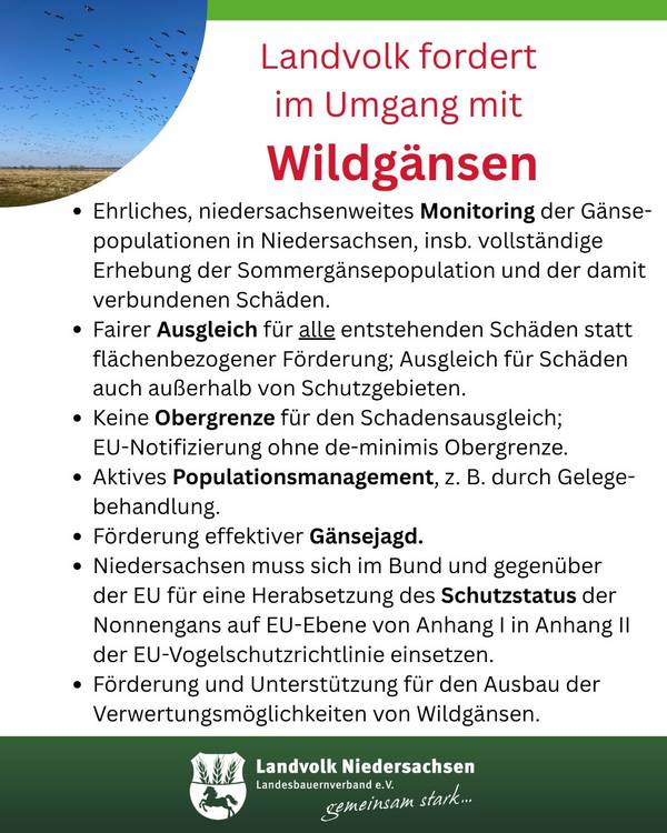 1. Ehrliches, niedersachsenweites Monitoring der Gänsepopulationen in Niedersachsen, insbesondere vollständige Erhebung der Sommergänsepopulation und der damit verbundenen Schäden.